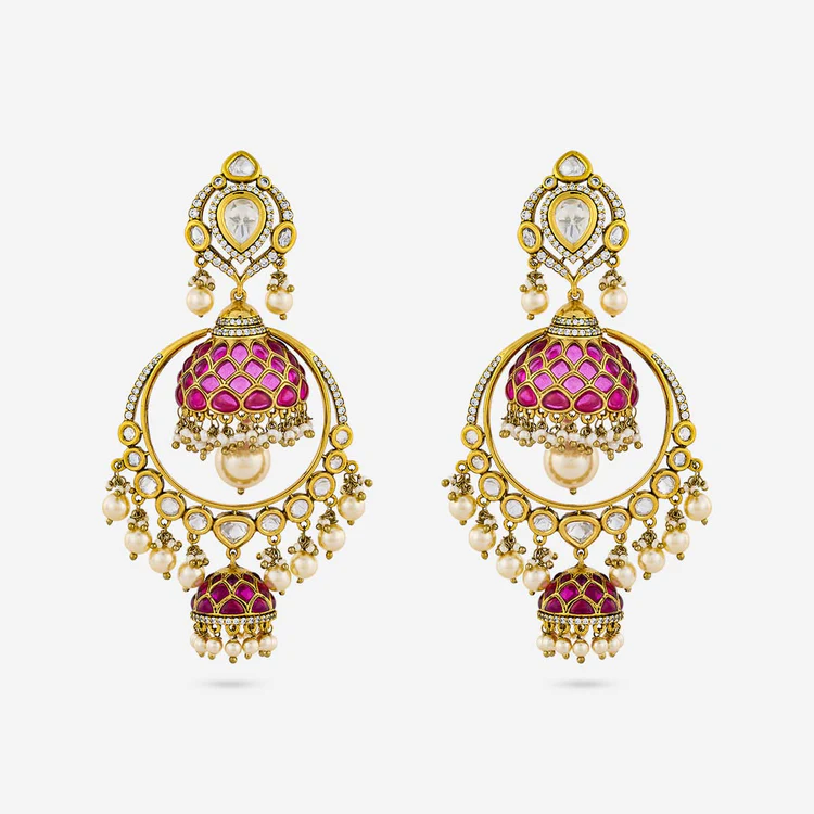a.Enhance your ethnic elegance with these Silver Gold Polished Kundan Chand Bali Earrings embellished with radiant ruby stones. Designed in a classic crescent (Chand Bali) silhouette, these earrings showcase exquisite Kundan craftsmanship paired with a rich gold polish that adds a luxurious finish. The vibrant ruby accents lend a regal charm, making these earrings a perfect blend of tradition and sophistication.