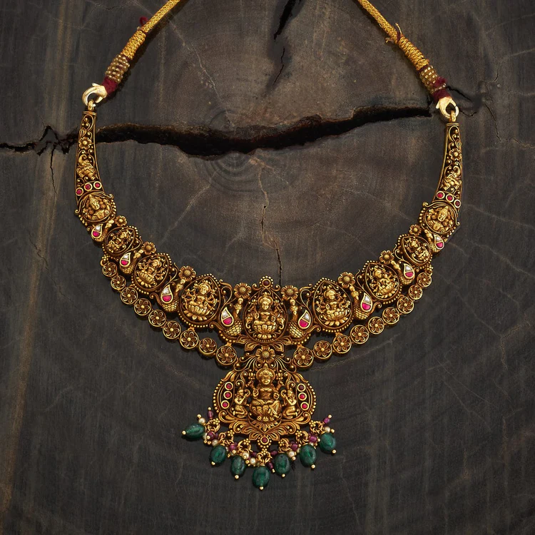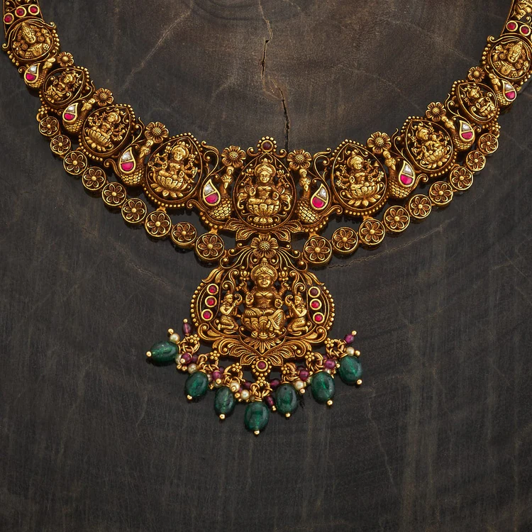 The necklace is adorned with vibrant ruby and emerald beads, adding a rich pop of color and enhancing its regal appeal. Crafted in high-quality silver with an antique finish, this temple necklace perfectly complements silk sarees, lehengas, and other ethnic ensembles. Ideal for weddings, festive occasions, and religious ceremonies, this statement piece exudes tradition, elegance, and spiritual charm.