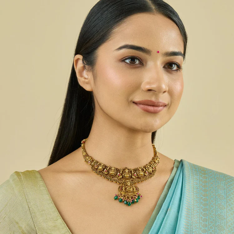 Elevate your traditional jewelry collection with this exquisite Silver Temple Necklace, inspired by the timeless beauty of South Indian temple artistry. The centerpiece features an intricately crafted Goddess Lakshmi motif, symbolizing wealth, prosperity, and divine grace. Surrounding the central motif is an elegant floral design, meticulously detailed to reflect heritage craftsmanship.
